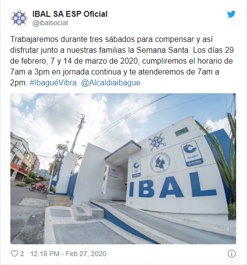 La Empresa Ibaguereña de Acueducto y Alcantarillado Ibal, estableció la compensación de la jornada laboral correspondiente a los días 6, 7 y 8 de abril de 2020, con el objetivo de garantizar el descanso durante Semana Santa de los servidores públicos, sin afectar la atención al público.