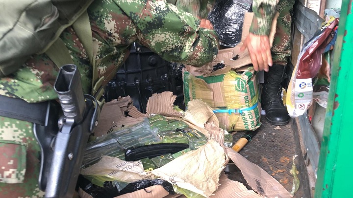 Gracias a información de Inteligencia Militar en el barrio Icacal del municipio de Melgar, momentos en que un camión de envíos transitaba por el casco urbano fue interceptado por Soldados del Gaula Militar Tolima adscritos a la Sexta Brigada del Ejército Nacional en coordinación con la Fiscalía 164 de la Dirección Especializada Contra Organizaciones Criminales y la Fuerza Aérea Colombiana, el cual al verificar en su interior, dentro de cajas y respuestos de vehículos se encuentra 345 kilos de material de guerra.