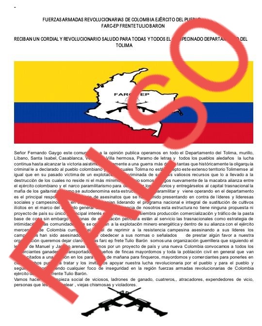 1. Teniendo en cuenta un video y un panfleto alusivos al autodenominado grupo "Frente Tulio Barón" que ha venido circulando en las últimas horas a través de redes sociales o grupos de Whatsapp, en el cual se da a conocer la presencia activa de este grupo en el norte del Tolima, se logra establecer que son absolutamente falsos donde se invita a la comunidad a no caer en este tipo de engaños con los cuales se busca generar futuras extorsiones.