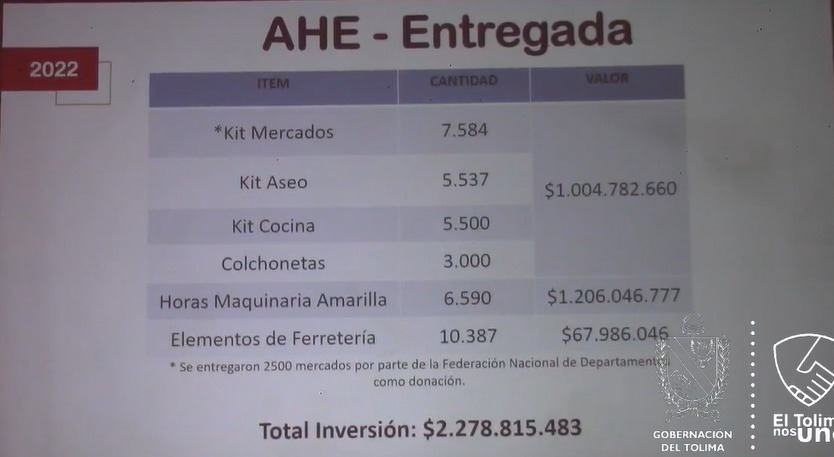 Según las cifras presentadas por la Gobernación, se ha realizado hasta el momento, en este mandato, una inversión de más de $90 mil millones en mejoramiento y mantenimiento de las vías del Tolima y se han entregado alrededor 30 mil kits entre mercados, implementos de aseo, cocina, colchonetas y elementos de ferretería, para las familias afectadas por la ola invernal. Además, se han liquidado más de 6 mil horas de maquinaria amarilla.