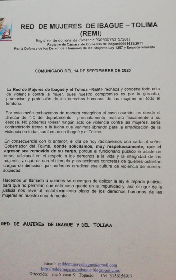 Al tiempo que condena el proceder del director de las TICs en la Gobernación del Tolima, Carlos Alberto Sánchez Alfonso, quien ha sido denunciado por su compañera sentimental por maltrato físico, la Red de Mujeres del Tolima, expresa que "radicaremos una carta al señor Gobernador del Tolima, donde solicitamos, muy respetuosamente, que el agresor sea removido de su cargo".