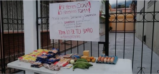 Sandra Grisales es concejala del Líbano por la Colombia Humana. Con Jhon Jairo García, su esposo, hace 4 días compraron un mercado de 70 mil pesos, sacaron una mesa, la pusieron a la entrada de la casa y con un aviso en una cartulina que decía o mejor, dice: "SI TIENES, DONA. SI NECESITAS, TOMA.