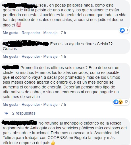 Leito Paredes va más allá y expresa que no está de acuerdo, muchos locales están cerrados, cómo van a cobrar lo mismo del mes anterior. Además los contadores están por fuera. Revisen la lectura no nos roben descaradamente Celsia, denunció Paredes.