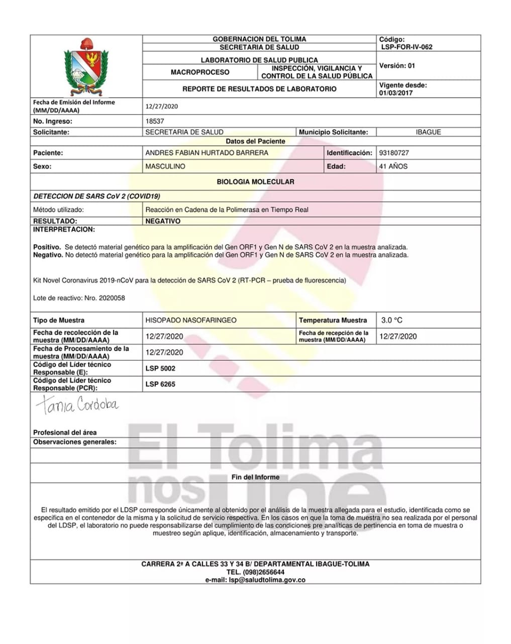 El alcalde de Ibagué, Andrés Hurtado, ha dado negativo en una nueva prueba de COVID-19, diez días después de anunciar que tenía la enfermedad y, la cual, le mantuvo aislado en su casa hasta este domingo 27 de diciembre.