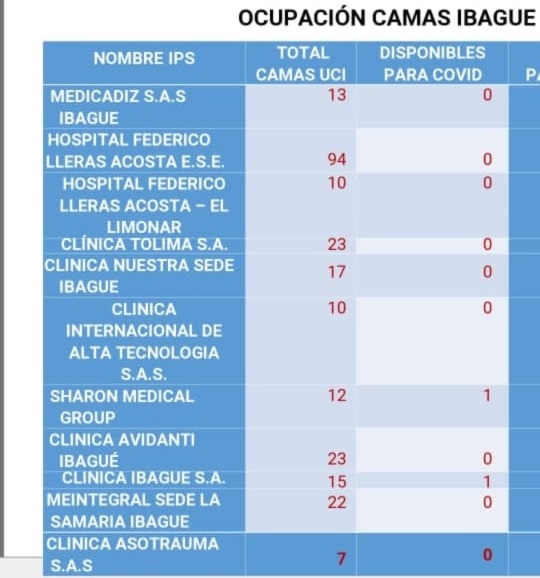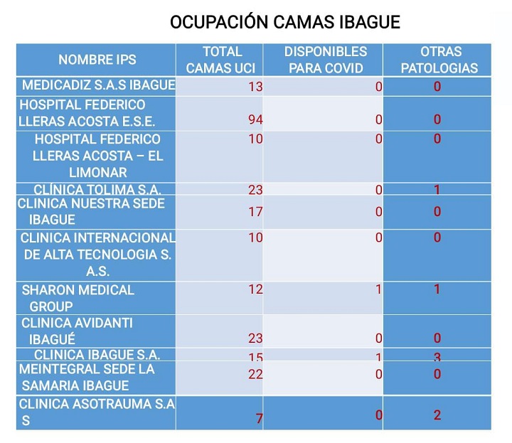 Sin embargo, en Ibagué el panorama es menos alentador. La ciudad cuenta con 246 camas UCI, de las cuales solo están disponibles dos para pacientes contagiados de covid-19 y siete para enfermos de otras patologías; por lo que la ocupación general de UCI en la capital tolimense, se encuentra en el preocupante 96%.