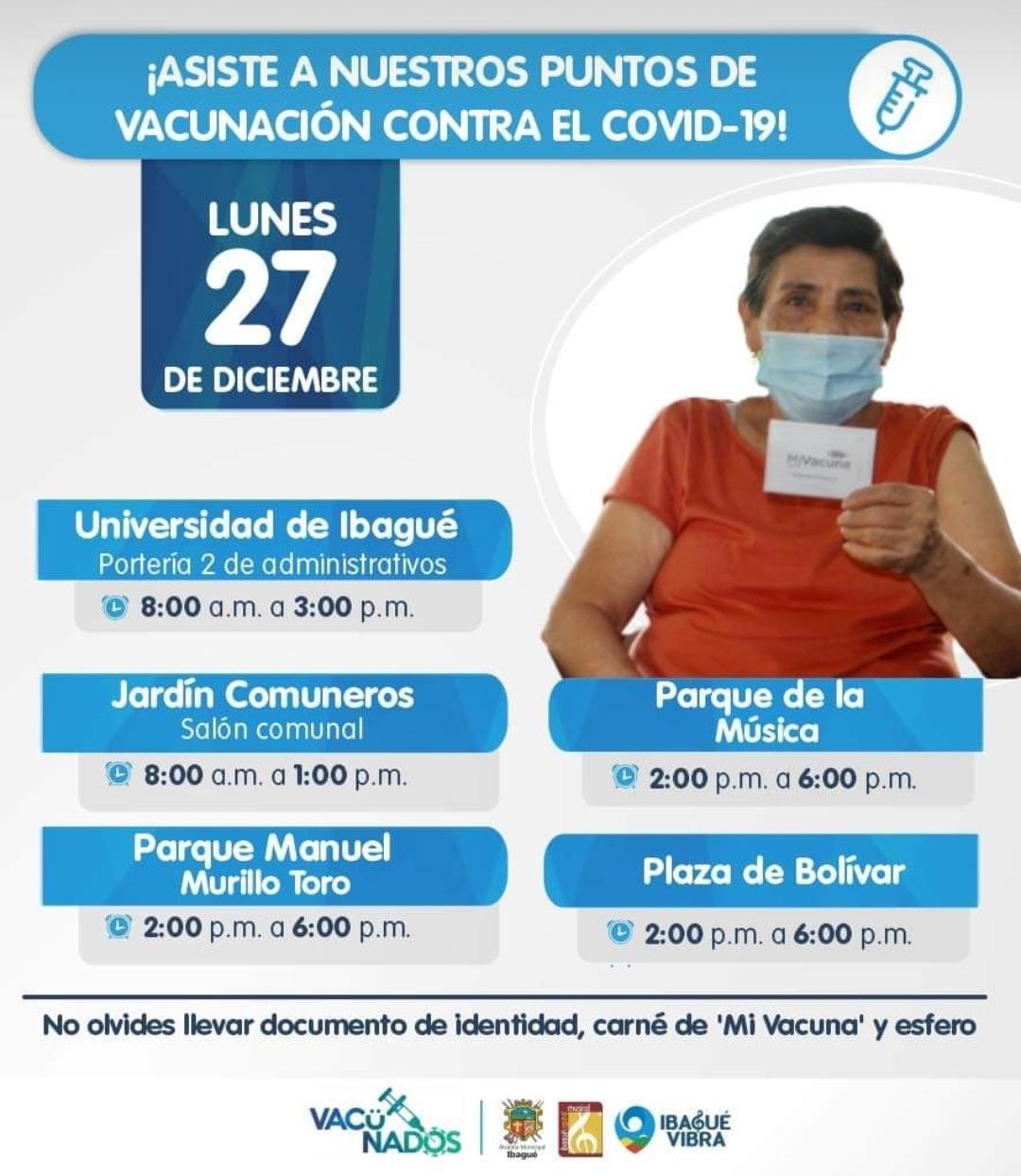 Del 27 al 30 de diciembre, y con el fin de avanzar en el proceso de inmunización de los ciudadanos, la Alcaldía de Ibagué tendrá varios puntos de aplicación de los biológicos contra el covid-19 en la Capital Musical.