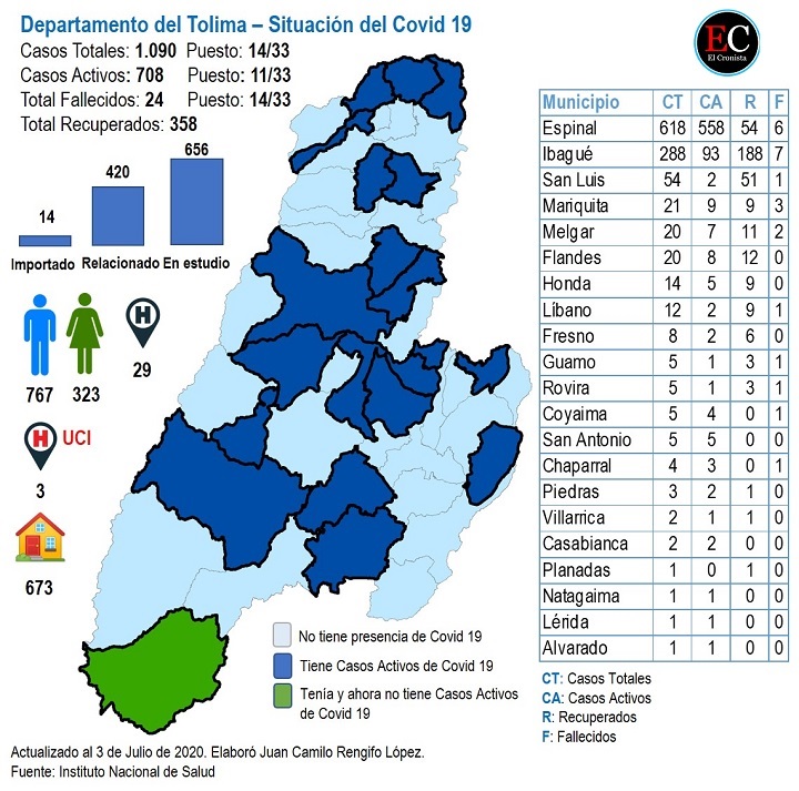 Este es el acumulado y la distribución de los 1.090 casos que se han registrado a la fecha, en 21 municipios del Tolima