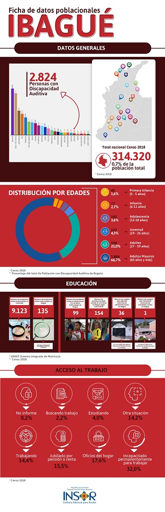 De las 10.049 personas registradas en el Tolima, 2.824 viven en Ibagué, lo que representa en ciudades capitales un 0.9% del tota del Censo 2018, indica el informe que relaciona un 1.6% de niños menores de cinco años con discapacidad auditiva. 2,7% entre los 6 a 11 años. 3,6% en edades que oscilan entre los 12 a 18 años. 4,3% entre los 19 a 26 años. 21% entre los 27 a 59 años de edad y 66,7% mayores de 60 años, una lectura similar al resto del país.