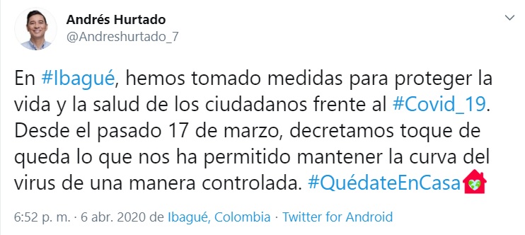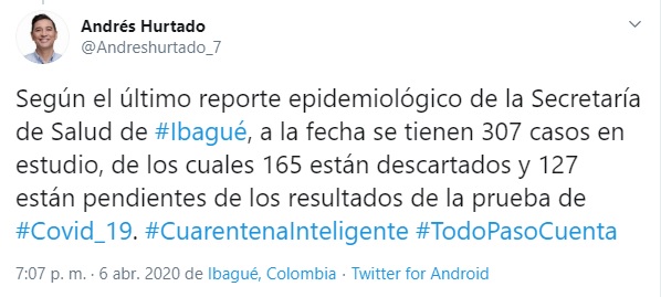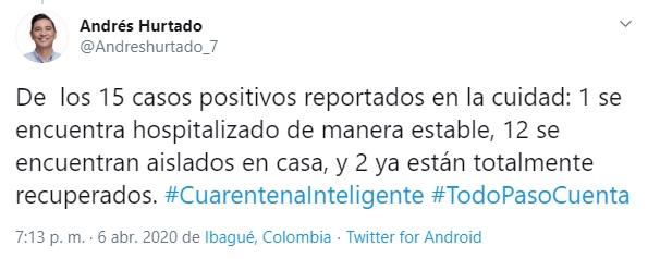 El alcalde Andrés Hurtado entregó un balance de las medidas implementadas para prevenir la propagación del covid-19. Hasta el momento en Ibagué existen 15 casos confirmados y dos personas recuperadas del virus.