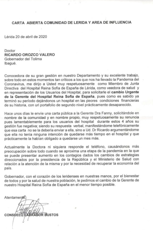 Es tanto el desespero, que al final de la carta el llamado es bien sentido. "Gobernador, con el corazón de los leridenses en nuestras manos, por el bienestar de todos y por la salud de nuestra población, le pedimos el cambio de la gerente de nuestro hospital en el menor tiempo posible".