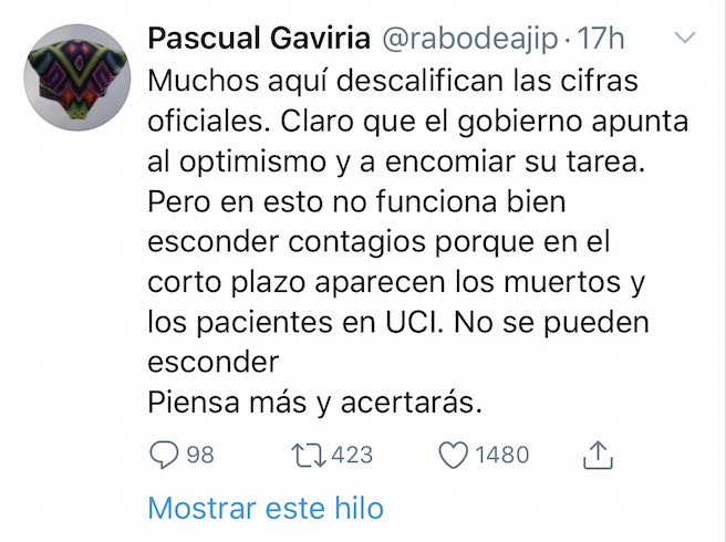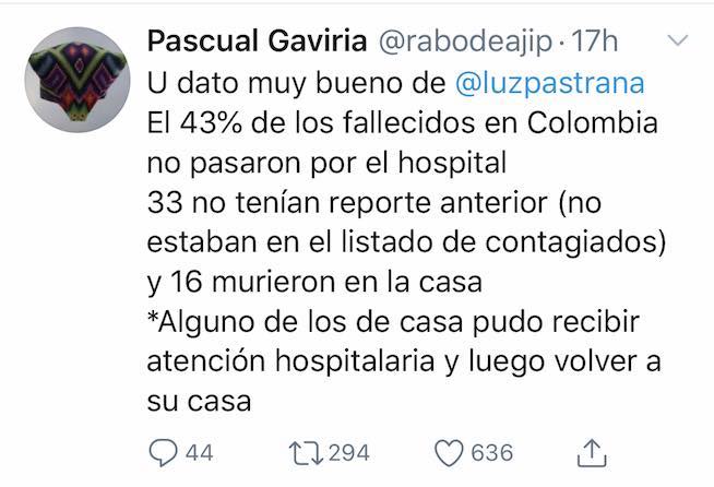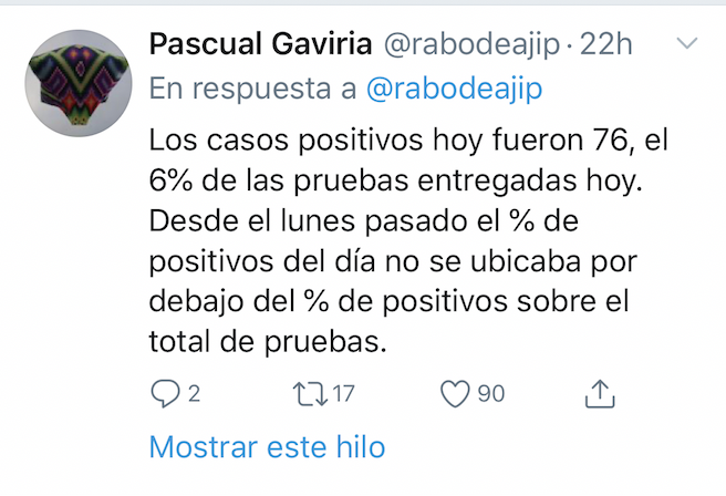 Hace pocos días el twitter del analista e integrante de La Luciernaga, el periodista Pascual Gaviria criticaba el porqué un día se hacían 100 pruebas, al otro 300 y luego se volvía a bajar, indicando con ello que algo estaba mal en ese proceso, hasta entonces centralizado en el Instituto Nacional de Salud.