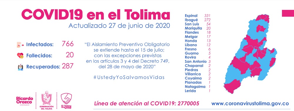 Entretanto, el número de muertos por coronavirus en el departamento se mantuvo en 20: Ibagué 5; El Espinal 4; Mariquita 3; Melgar 2; Guamo, San Luis, Chaparral, Rovira, Líbano y Coyaima 1 fallecimiento.
