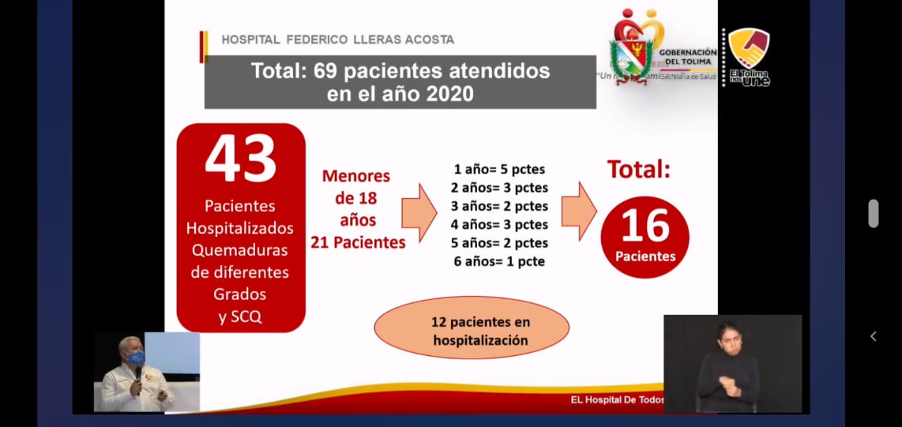 El Hospital Federico Lleras, entrega un balance de cifras de lo que ha sido la atención a pacientes quemados, quienes en el año 2020 aumentaron en un total de 69 pacientes, de los cuales 43 han sido hospitalizados por quemaduras de diferentes grados. De este número, 21 pacientes, casi el 50% de los atendidos son menores de 18 años, es decir población pediátrica; y 16 pacientes son menores de 6 años, de los cuales cinco tenían un año de edad.
