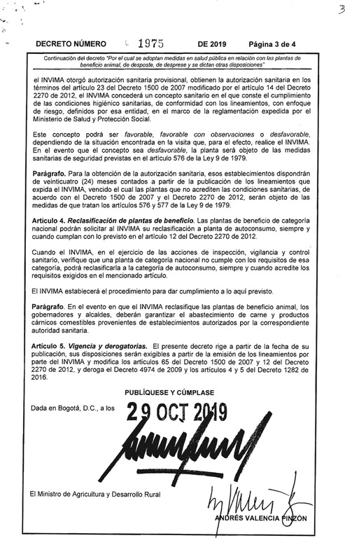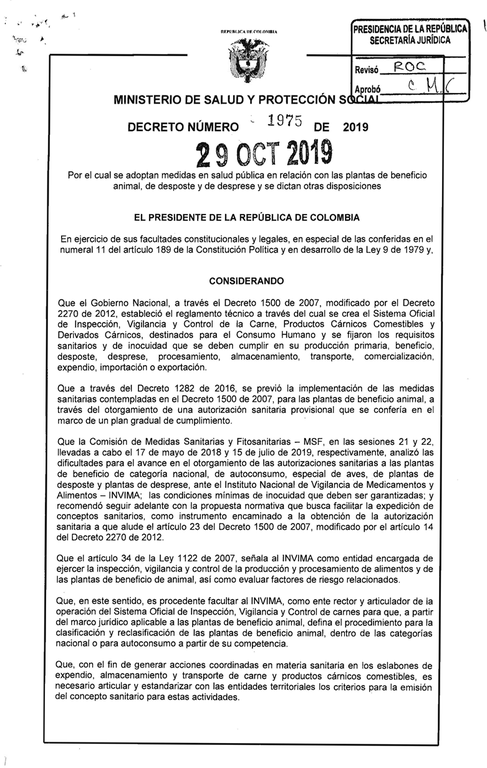 El gobierno nacional a través del ministerio de Salud y Protección Social expidió la resolución 1975 por medio del cual adoptó una serie de medidas en relación con las plantas de beneficio animal, de deposte y desprese, modificando de esta manera las acciones que realizan en la actualidad los mataderos de los diferentes municipios del país.