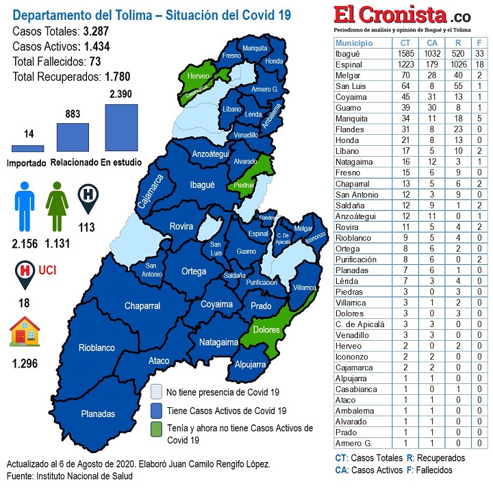 En su más reciente informe, el Ministerio de Salud reportó 84 casos nuevos de coronavirus en el Tolima. Así las cosas, el departamento acumula 3.287 contagiados, de los cuales se han recuperado 1.732.