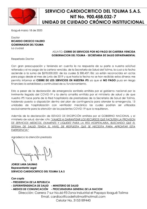 Finalmente, el representante legal del Servicio Cardiocrítico del Tolima, Jorge Lara Salinas, ha señalado que es importante tener saldada la deuda con el fin de prestar un servicio de urgencias, con una respuesta inmediata para afrontar la emergencia.