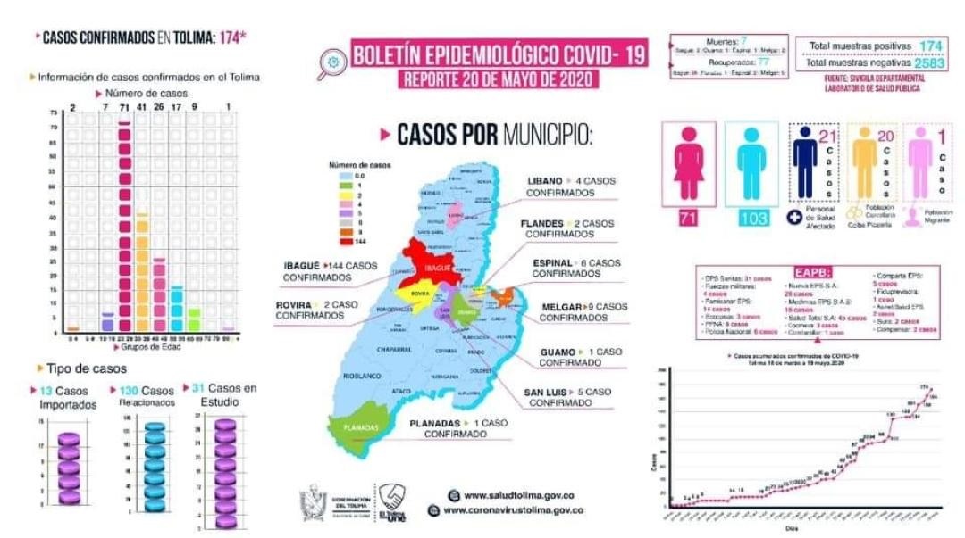 Teniendo en cuenta los casos confirmados este miércoles, la distribución en el departamento es la siguiente: Ibagué 145, Melgar 9, Espinal 6, San Luis 5, Líbano 4, Rovira 2, Flandes 2; Guamo, Planadas y Piedras 1 caso. El número de mortalidades es de siete y los pacientes recuperados aumentaron a 80.