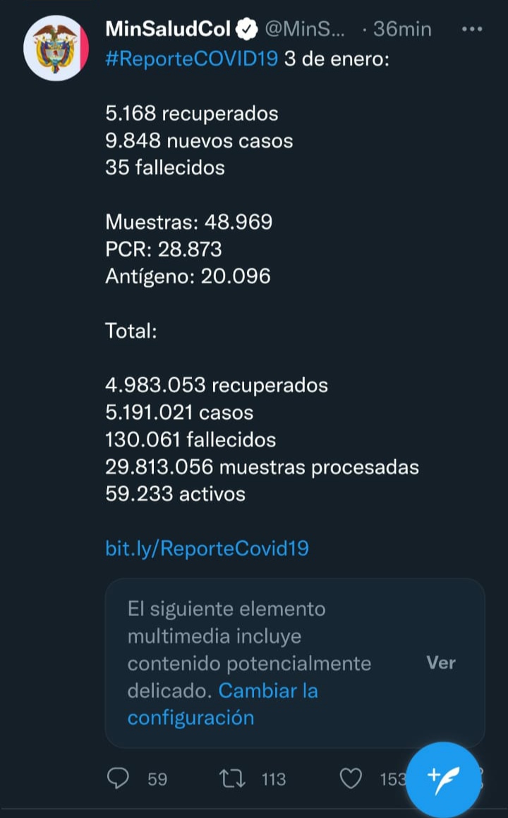 Por su parte el Ministro de Salud, Fernando Ruiz en un nuevo mensaje, reiteró que "Ómicron, la nueva variante de Covid-19 ya está en Colombia, es mucho más contsgiosa que cualquier otra variante conocida hasta el momento y, para evitar la enfermedad grave y la muerte, las vacunas siguen siendo las más efectivas".