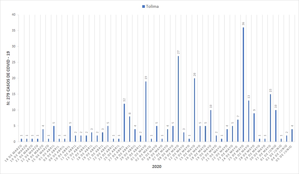 En su más reciente informe el Ministerio de Salud confirmó tres casos más de covid-19 en el Tolima, que acumula 279 personas diagnósticadas como portadoras del virus desde que llegó la pandemia. En lo corrido de esta semana lo nuevos infectados han disminuido considerablemente; el principal foco del virus en el departamento es la Escuela de Policías en San Luis.