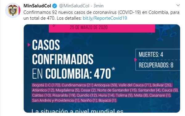 Con este informe el país tiene en total 170 casos en Bogotá, 21 en Cundinamarca, 59 en Antioquia, 71 en el Valle del Cauca, 26 en Bolívar, 12 en Atlántico, 5 en Magdalena, 2 en Cesar, 15 en Norte de Santander, 4 en Santander, 9 en Cauca, 10 en Caldas, 19 en Risaralda, 12 en Quindío, 14 en Huila, 9 en Tolima, 8 en Meta, 1 en Casanare, 1 en San Andrés y Providencia, 1 en Nariño y 1 en Boyacá.