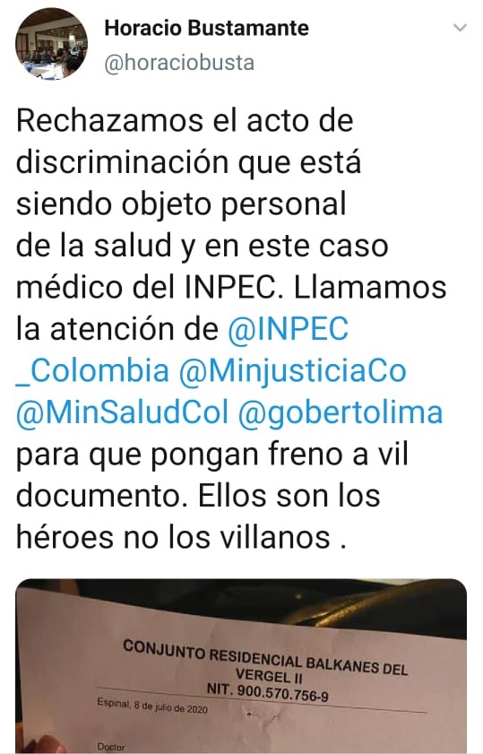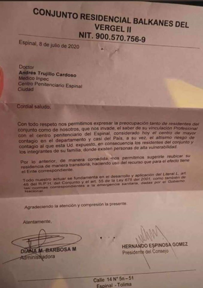El médico Andrés Trujillo Cardoso, quien labora en la cárcel de El Espinal, fue sorprendido el día de ayer con una carta de la administración del conjunto donde reside, en la cual le solicitan que abandone su vivienda. Su trabajo en el centro penitenciario, donde hay 544 contagiados de covid-19, generó el temor y rechazo de sus vecinos.