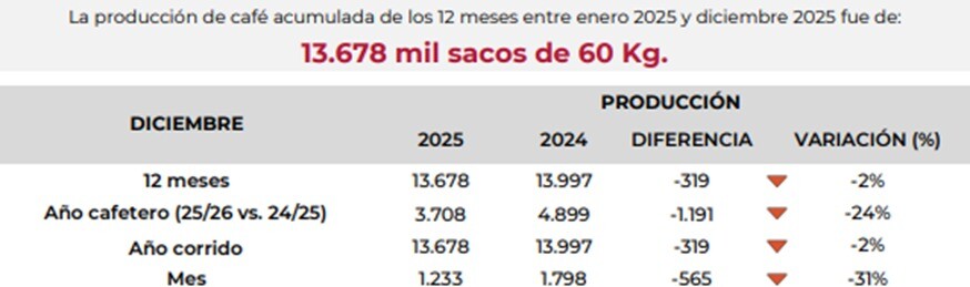 En ese orden, entre enero y diciembre de 2025, la producción acumulada alcanzó los 13.678 mil sacos de 60 kilos, frente a 13.997 mil sacos en el mismo periodo de 2024, lo que representó una variación de -2%.