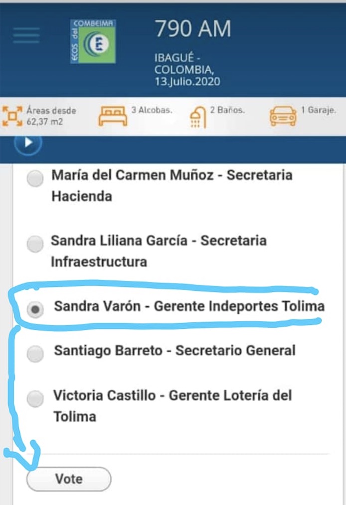 En esos sondeos insulsos que a diario se inventan los cazadores en búsqueda de indulgencias, está rodando uno por ahí donde se pide votar por el funcionario que considere más destacado de la gobernación del Tolima. Entonces, la Gerente de Indeportes Sandra Varón, muy acuciosa, envía mensajes indicando cómo votar por ella. Vale la pena preguntarle a la funcionaria cuánto tiempo pierde en este inoficioso acto. Por favor a trabajar y dejen de perder el tiempo, podría decirle el gobernador Orozco.